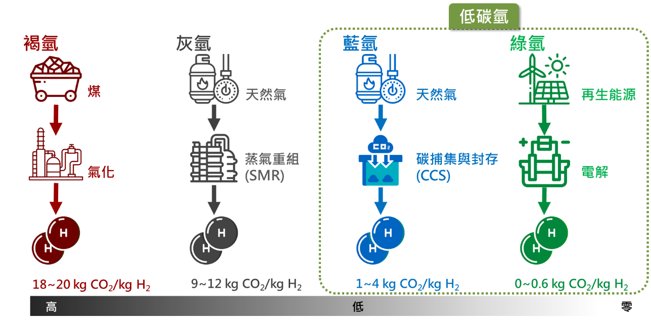 為了區別不同原料與製程在合成氫能過程中的排碳量程度之差異,可主要以下四種,包含褐氫、灰氫、藍氫與綠氫,其中藍氫與綠氫被視為主流的低碳氫,因此其對於淨零排放具極高的發展潛力。以綠氫為例,綠氫是透過再生能源(如風能與太陽能)應用於水電解為氫氣和氧氣。由於電力來自可再生資源,綠氫被視為一種零碳燃料。